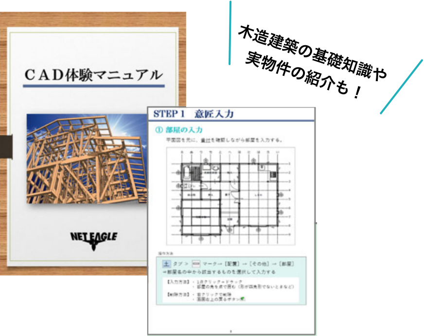自社開発CADソフトを使用して一から平屋の一軒家を設計していただきます。当社のCADソフトは単に設計データを作成するだけでなく、建物の耐震性を計る構造計算や、建物が持つ省エネルギー対策の程度を計算する省エネ計算など、様々な計算を簡単に行えることも特徴です。実際に各種計算まで行っていただきますので、自社製品の利便性を実感していただけるような内容となっています。